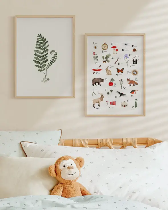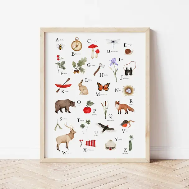 Affiche amusante et éducative pour découvrir les animaux, les plantes et les objets que l'on retrouve lors d'une aventure en forêt ou à la campagne.