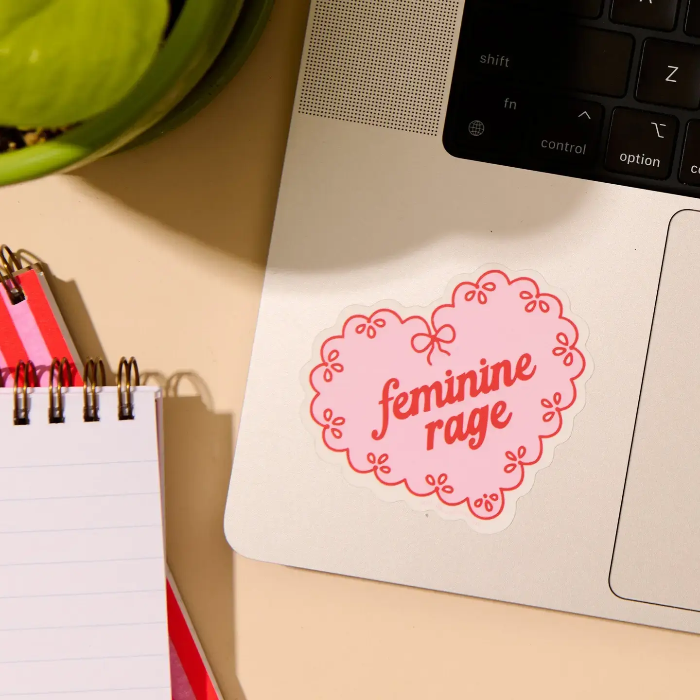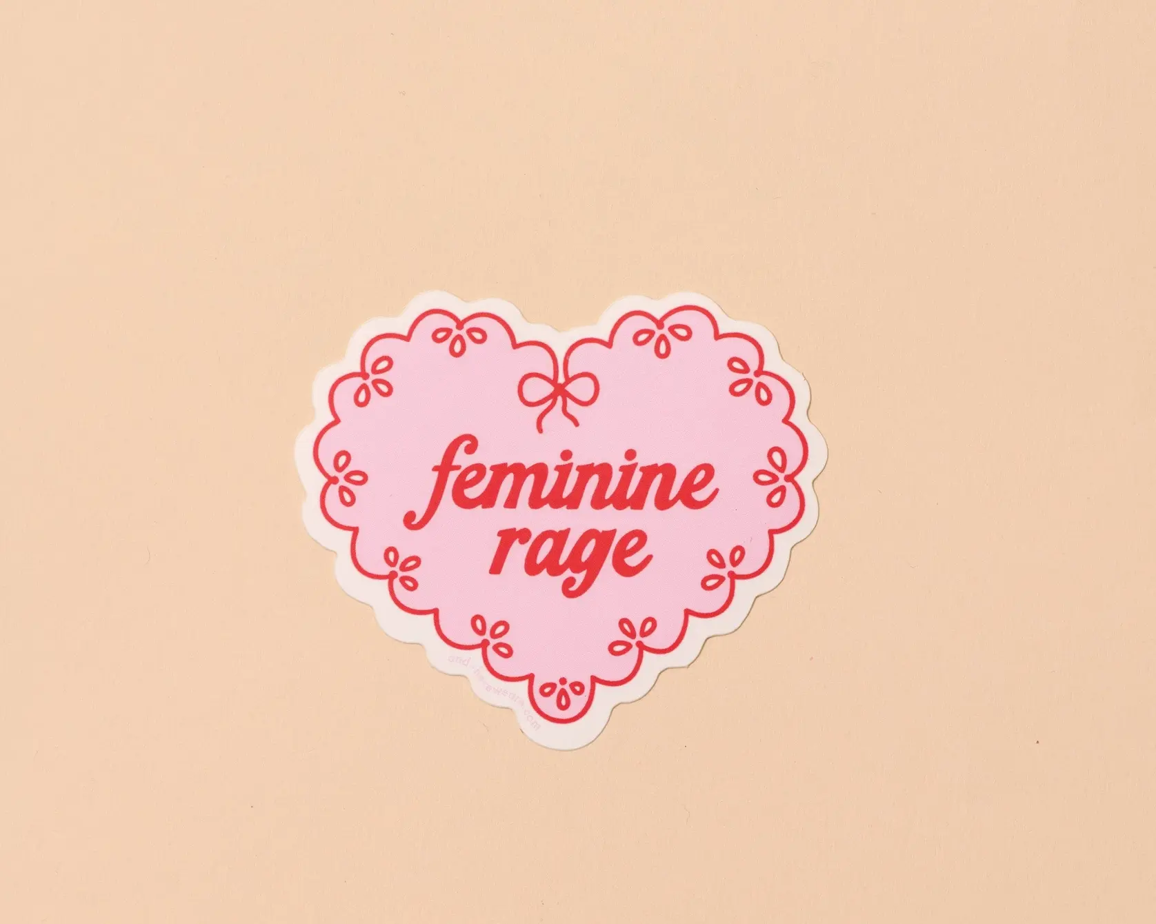Un autocollant en vinyle moderne signé Your Gal Kiwi, représentant un cœur en napperon dentelle avec l’inscription « Feminine Rage ». Une pièce audacieuse à afficher sur ordinateurs portables, bouteilles d’eau et carnets.