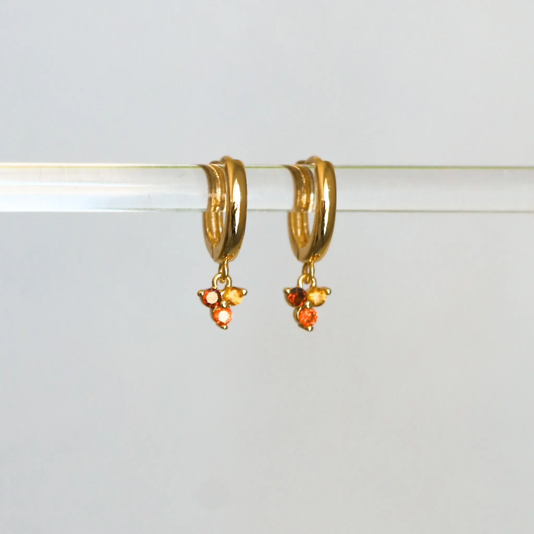 Boucles d'oreilles de type anneaux dormeuses avec pendentif composé de 3 zircons dans les teintes d'orange.