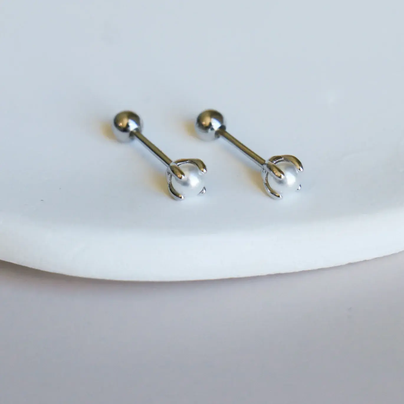 Boucles d'oreilles de style studs avec petite perle. Fermeture avec bille à visser à l'arrière. Délicates et passe-partout, elles sont un classique confortable à avoir!