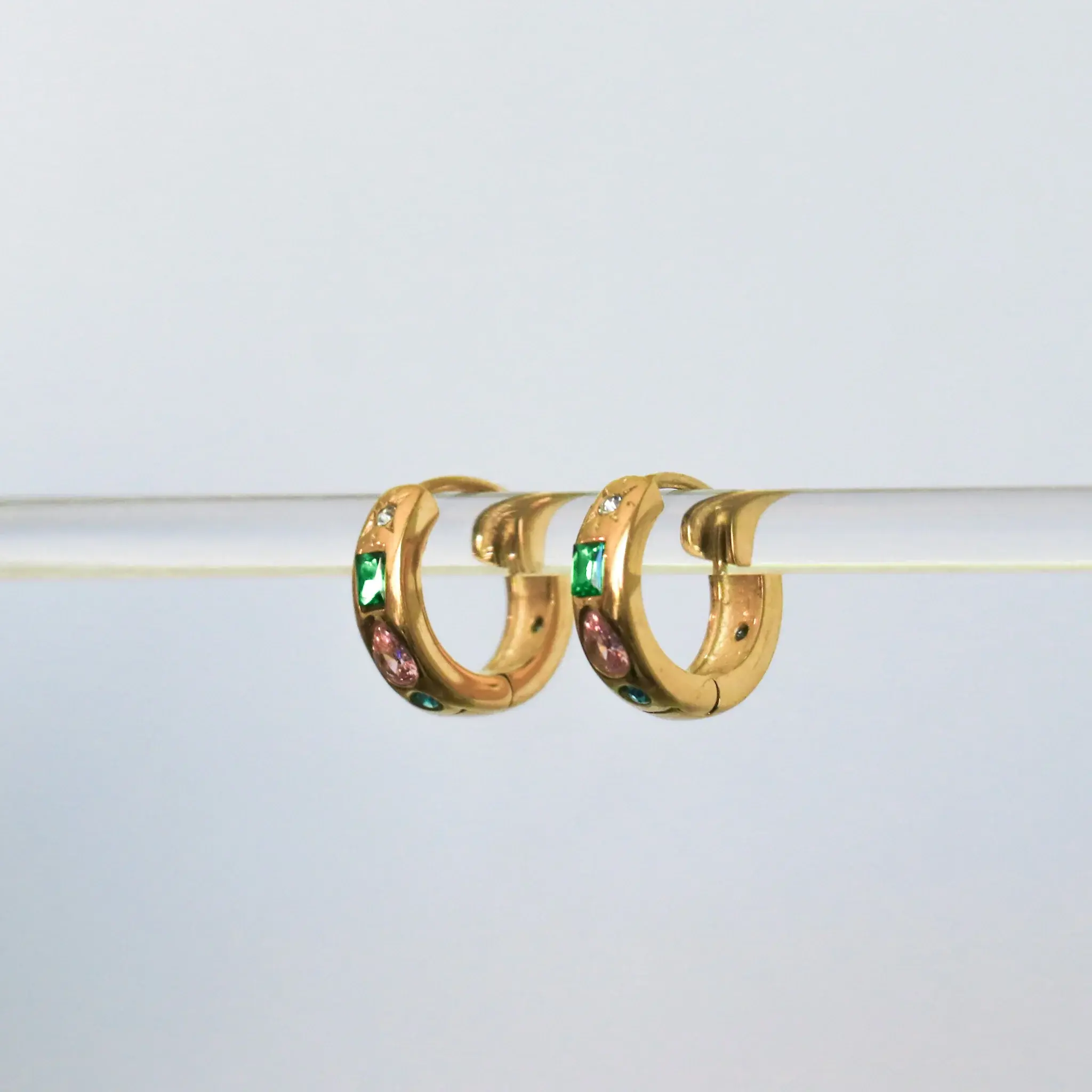 Boucles d'oreilles de type anneaux avec petits zircons de couleurs et forme variées.