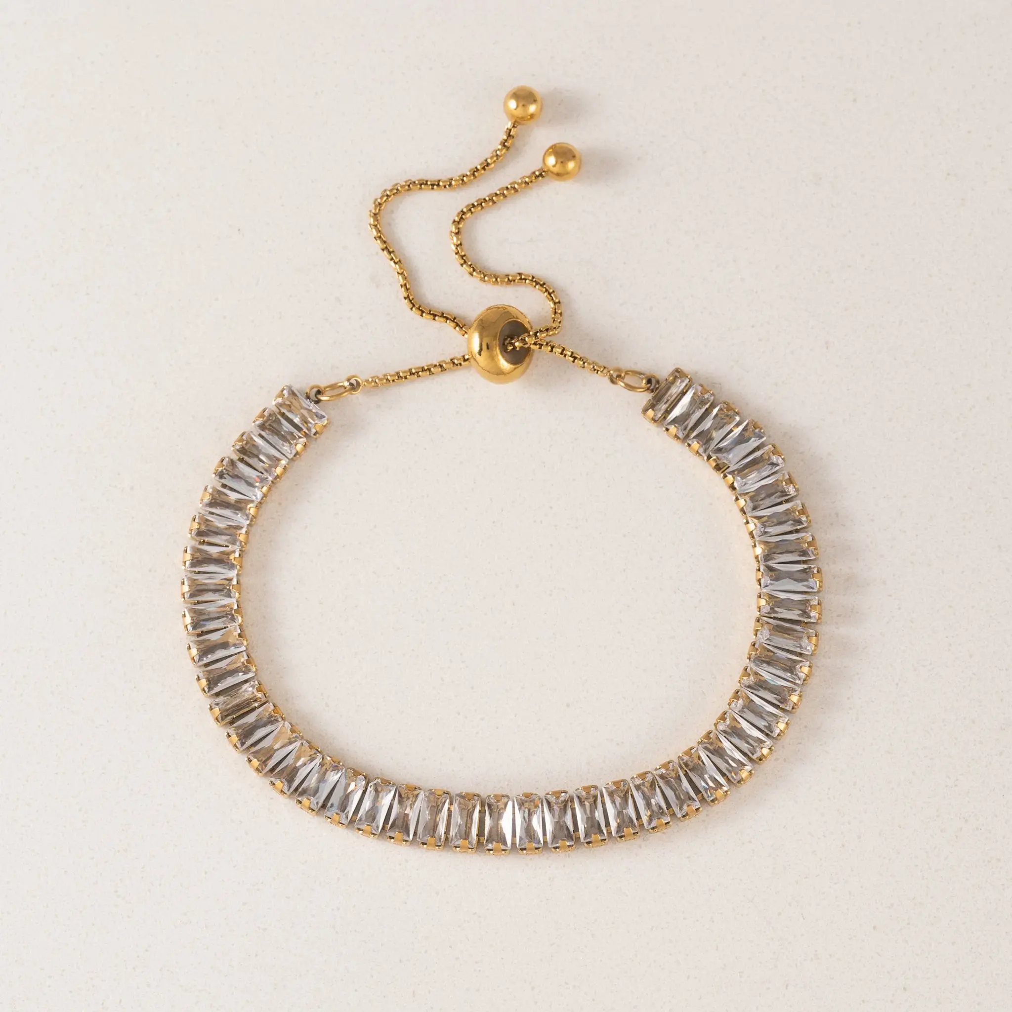 Un rang de cristaux en forme de baguette illumine votre poignet. Fabriqué en acier inoxydable et PVD, ce bracelet étanche vous accompagnera partout.