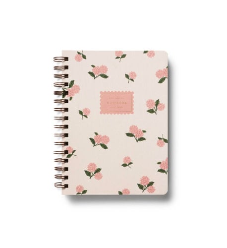 Imprimé sur du papier texturé épais, ce carnet à spirale souple présente une couverture illustrée de fleurs d'hydrangée roses et des détails dorés. Il contient 150 pages lignées et perforées, une reliure à double spirale robuste et des pochettes de rangement.
