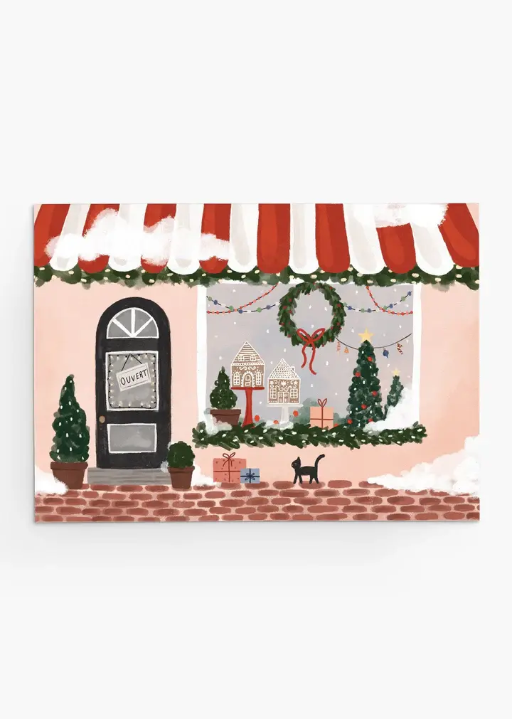 Blottissez-vous sous la couette avec la carte de vœux de Noël Charmante boutique! Admirez la charmante vitrine de la boutique, décorée de maisons en pain d'épice, de sapins enneigés et d'une couronne de Noël. Et n'oubliez pas: il neige! Pour des vœux féériques sous la neige.