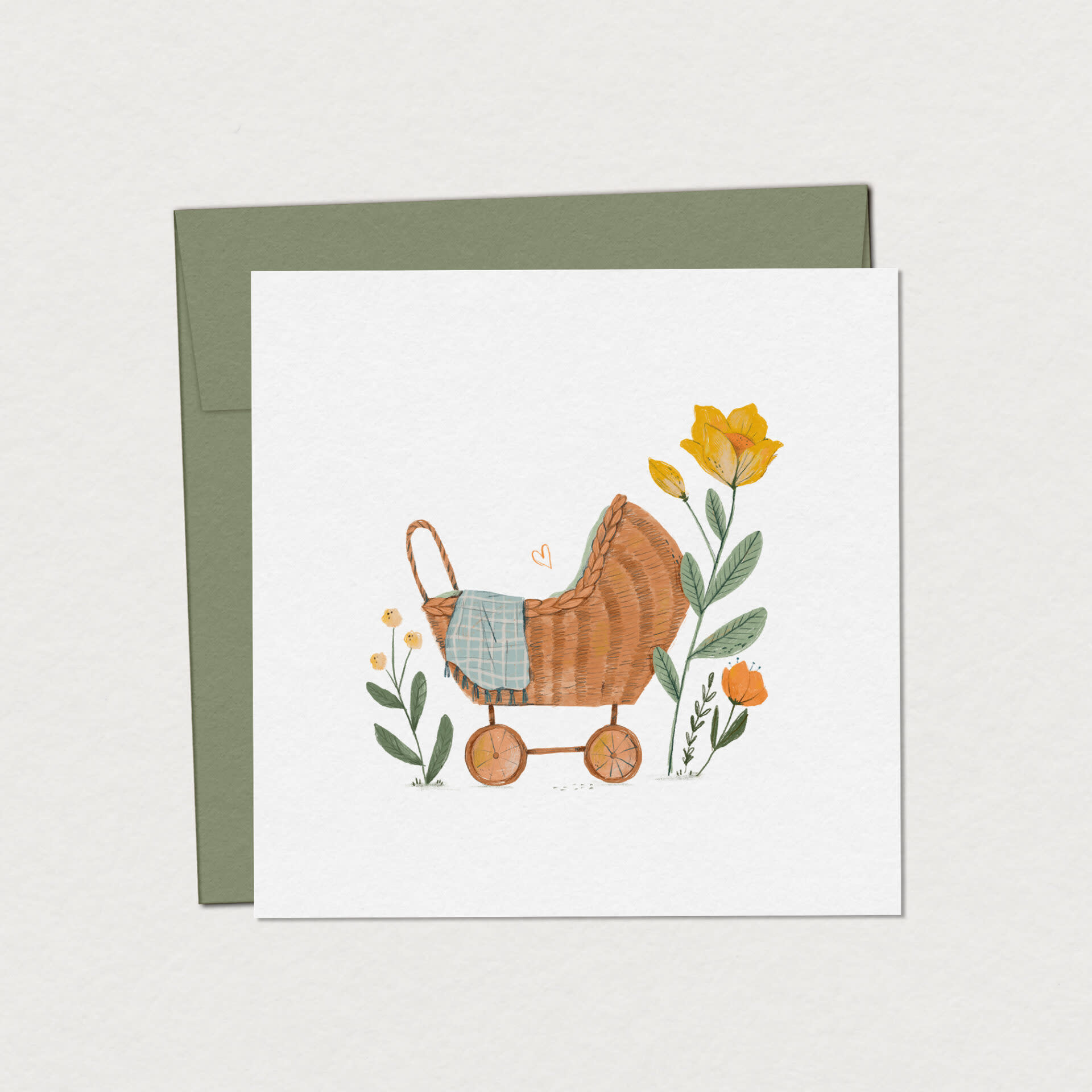Cette carte de vœux adorable présente une illustration douce et attendrissante d’un landeau délicatement orné, prêt à accueillir les précieux débuts d’une nouvelle vie. Les tons doux et les détails délicats de l’illustration capturent l’excitation et la tendresse entourant l’arrivée imminente d’un bébé. Un message de félicitations ou de bienvenue trouvera parfaitement sa place aux côtés de cette représentation évocatrice de joie et d’attente.