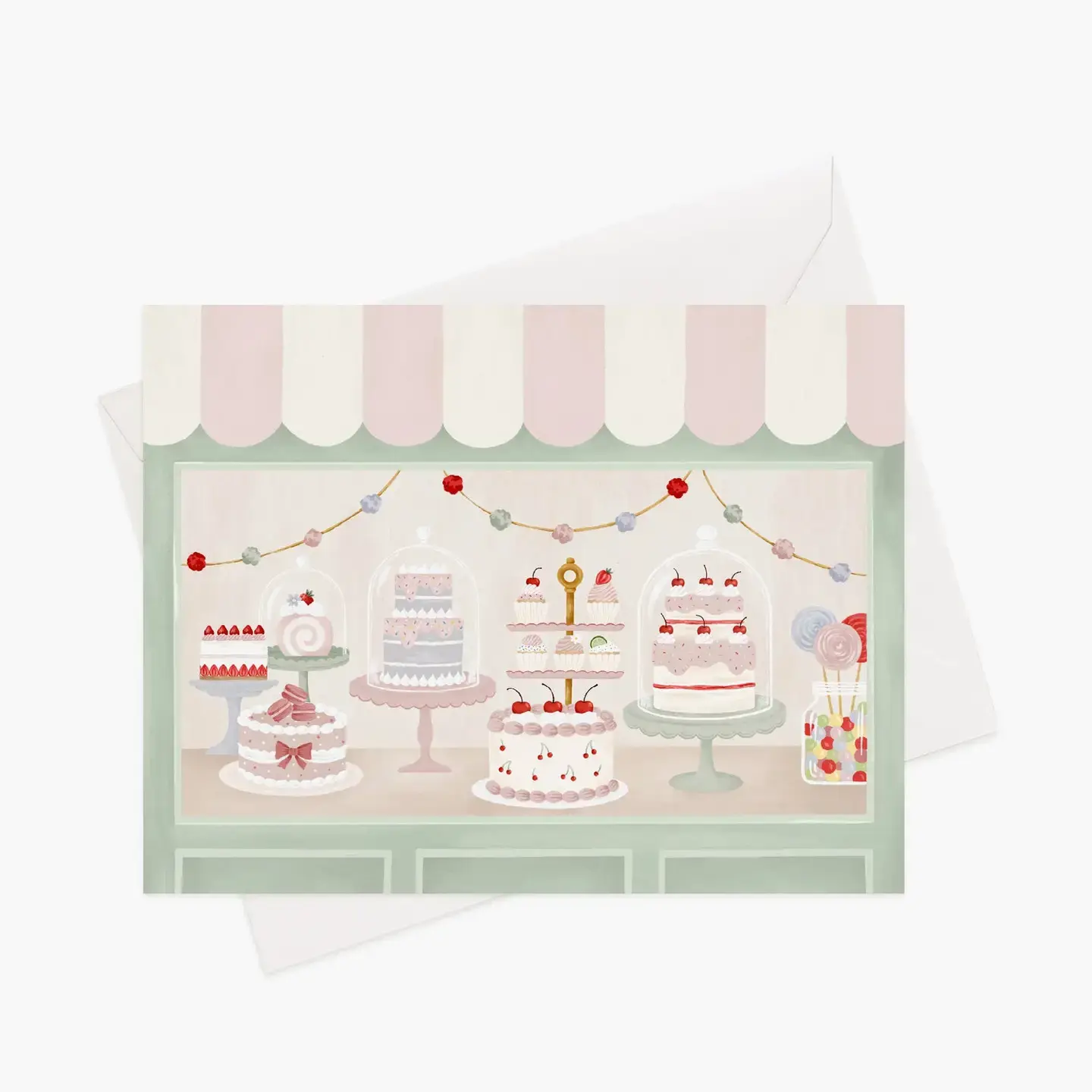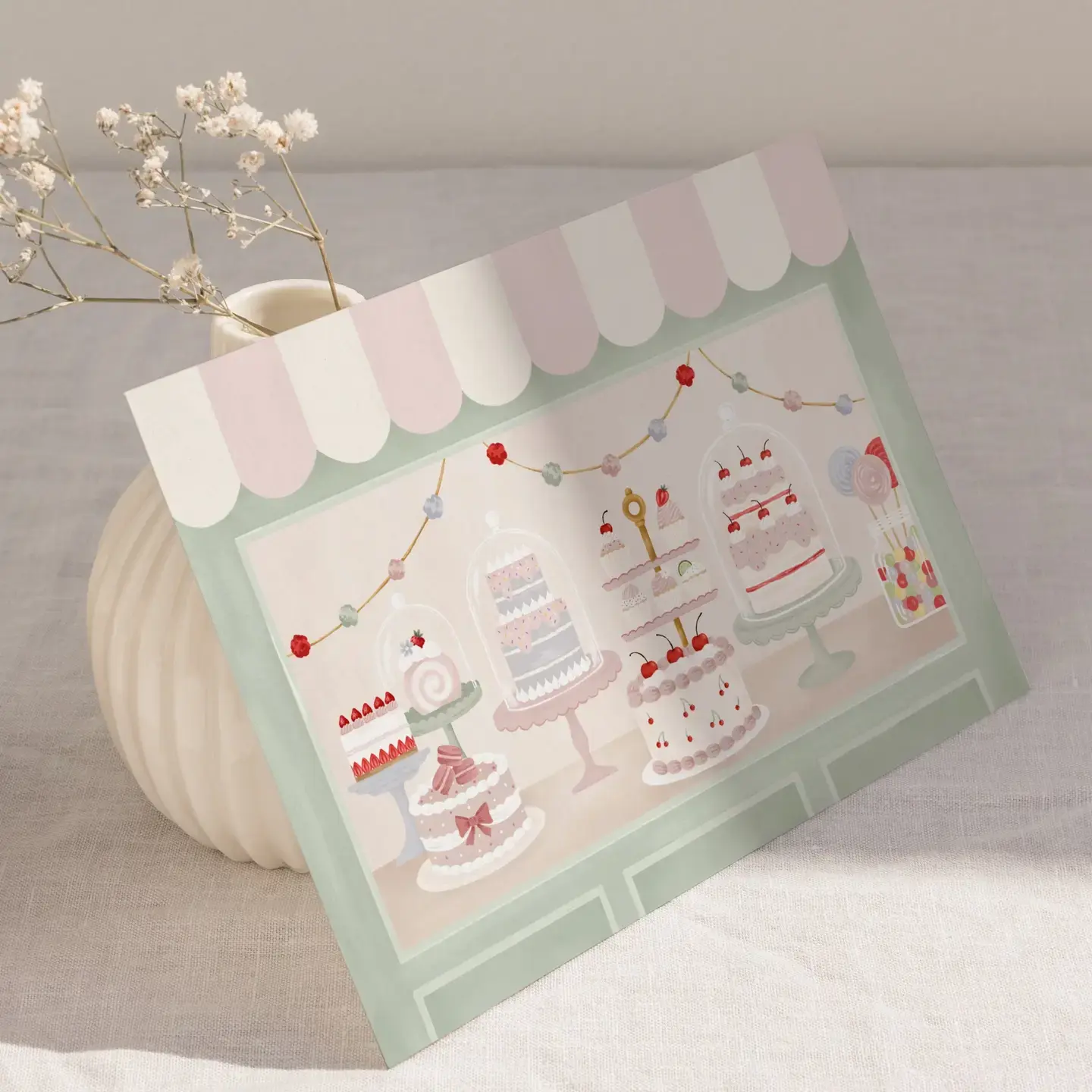 Carte de souhaits pour toutes les occasions! Illustration d'une vitrine de gâteaux succulents et colorés, inspirée des pâtisseries parisiennes.