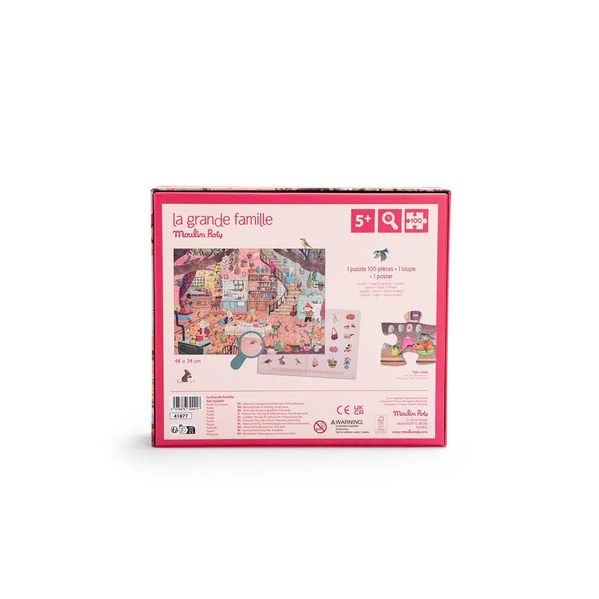 Le puzzle d'observation La Grande Famille est composé de 100 pièces. Après l'avoir reconstitué, les enfants s'amuseront a retrouver les animaux et les objets cachés dans l'illustration, en s'aidant de la loupe.
