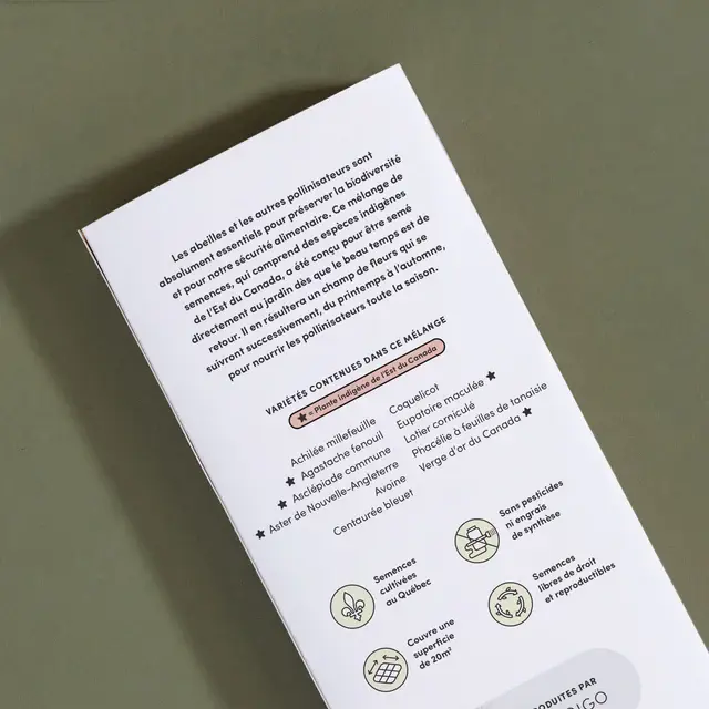 Ce mélange de semences peut être semé directement au printemps, dès que tout risque de gel est passé. Il a été conçu pour créer un véritable buffet pour les pollinisateurs, ainsi que pour les yeux! Il contient 10 espèces de plantes qui fleurissent de juin à octobre, afin que les travailleurs ailés puissent butiner dans votre jardin toute la saison. Il comprend également des plantes indigènes de l’Est du Canada afin de s’assurer que les pollinisateurs d’ici aient accès à une source de nourriture qui leur convient.