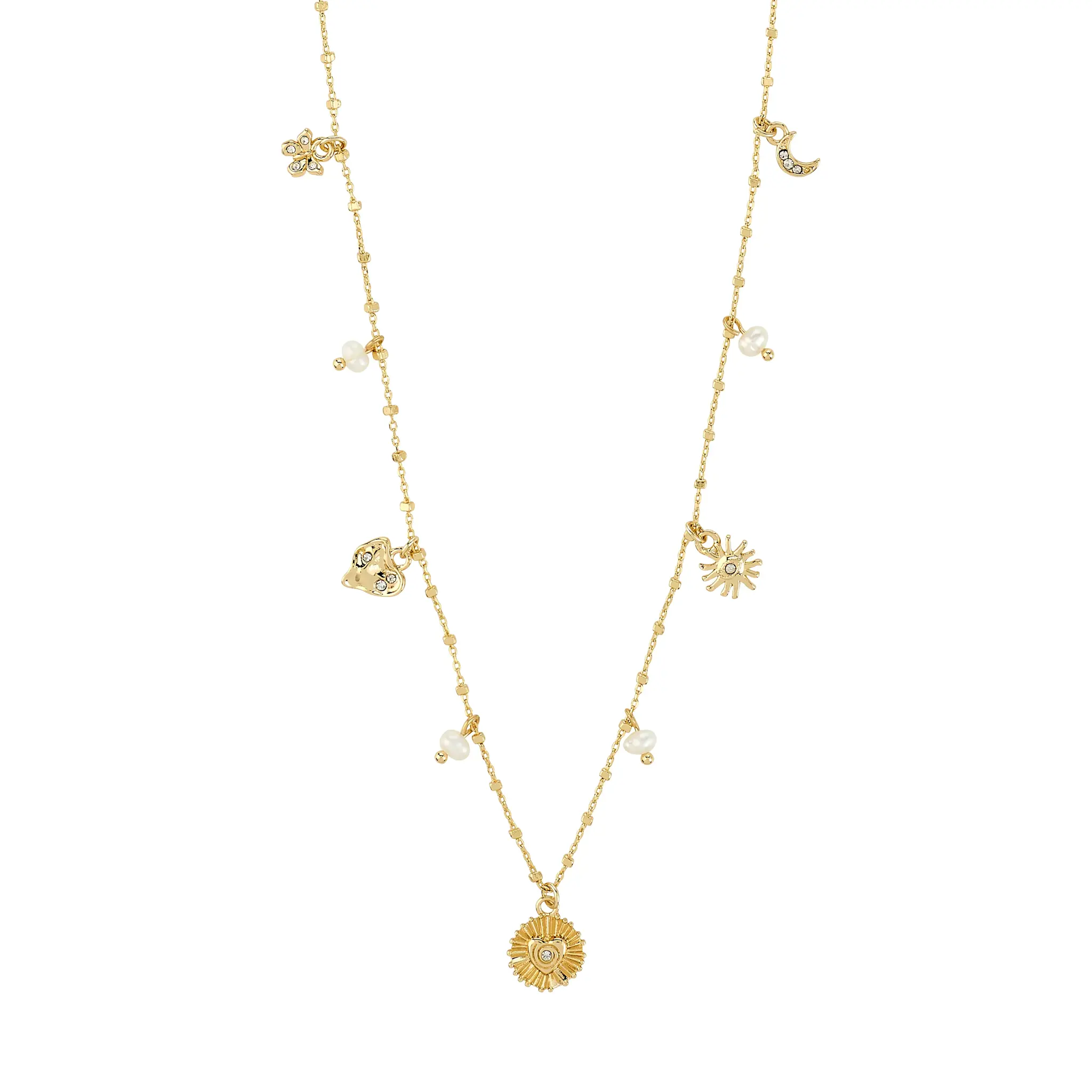 Laissez la magie opérer! Le collier MYLAN plaqué or de Pilgrim est votre nouvel amulette du quotidien. Orné de breloques symboliques – soleil, lune et cœur – il diffuse une énergie positive et une touche de magie. Perles et pendentifs finement travaillés lui confèrent une allure poétique et invitent à la contemplation. Portez-le seul pour affirmer votre personnalité ou associez-le à d'autres chaînes pour un style onirique et raffiné. La chaîne mesure 38 cm avec une rallonge de 9 cm et est composée à 93 % de matériaux recyclés – car une énergie positive passe aussi par des choix responsables.