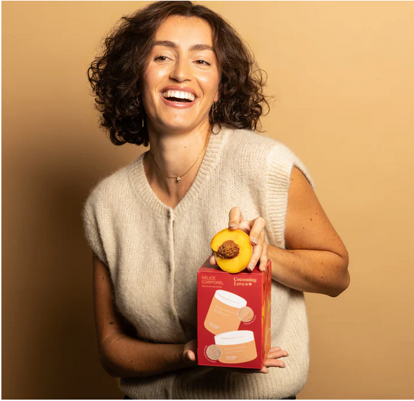 - suivi d’un beurre fouetté onctueux pour nourrir et envelopper la peau d’un parfum sucré et fruité.