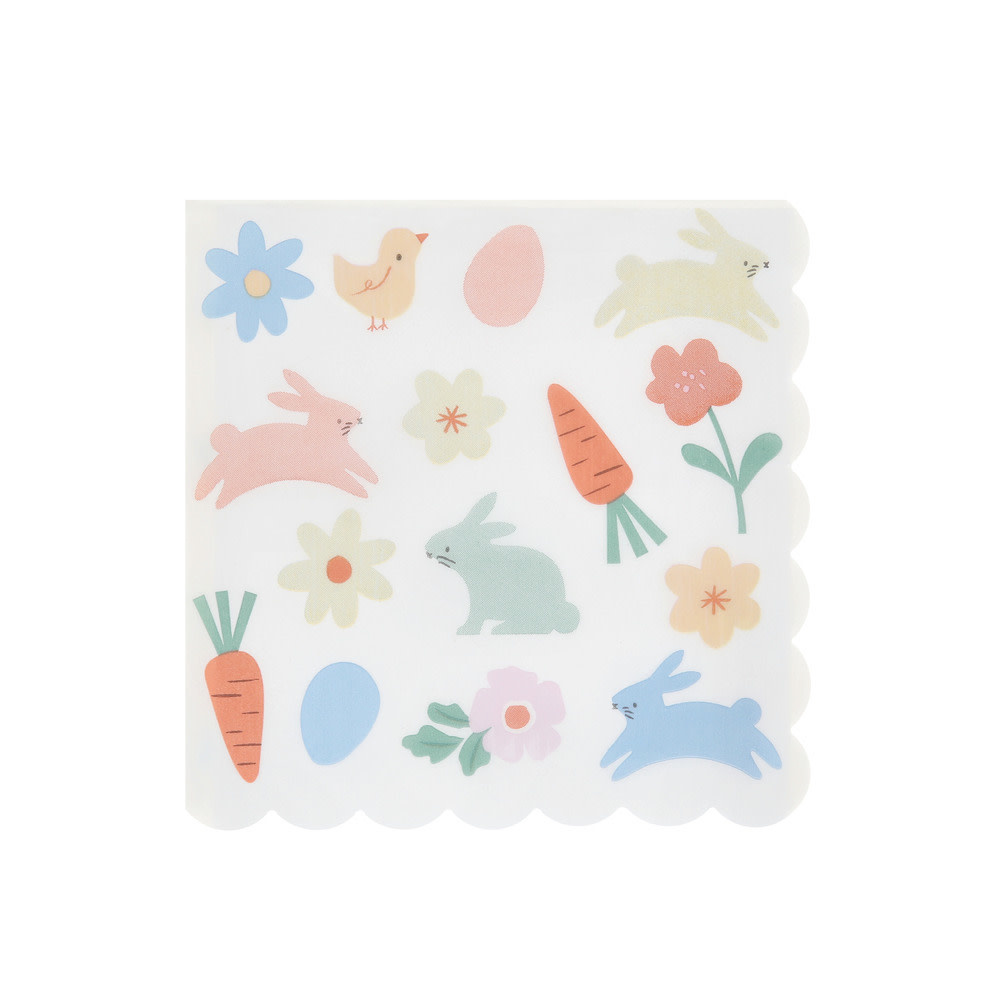 Sublimez Pâques avec ces élégantes serviettes en papier festonnées. Chacune d'elles arbore de charmantes illustrations de lapins, de carottes, de fleurs, d'un poussin et d'œufs, apportant une touche ludique et décorative à votre fête.