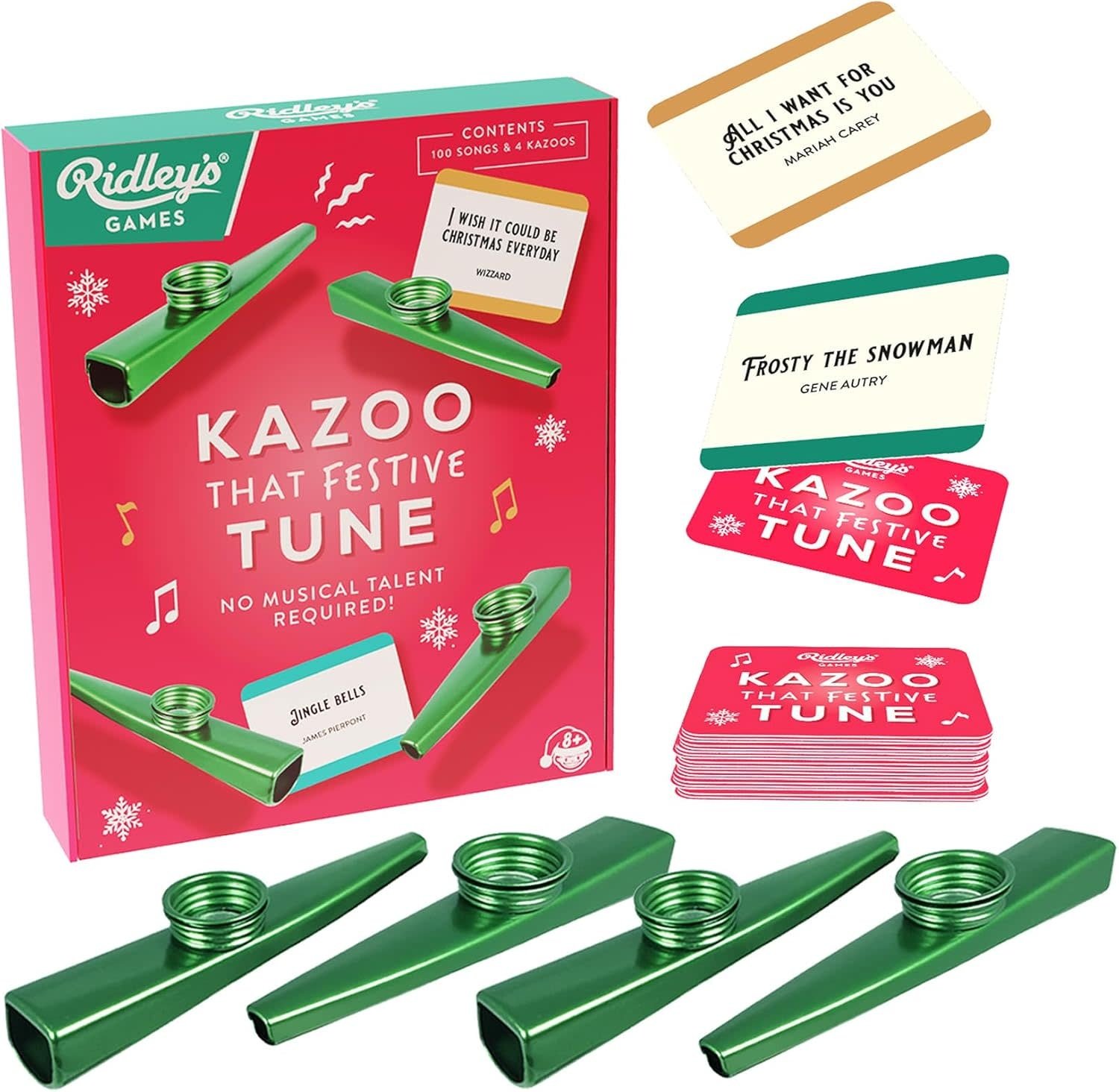 Aucun talent musical n'est requis pour jouer à Kazoo, cet air festif des Jeux de Ridley! Apportez joie et gaieté à la période des fêtes avec ce jeu familial amusant! 100 airs festifs connus à fredonner dans quatre kazoos sont disponibles. Entourez-vous de personnes qui aiment rire et donnez-vous à fond pour créer des souvenirs inoubliables.