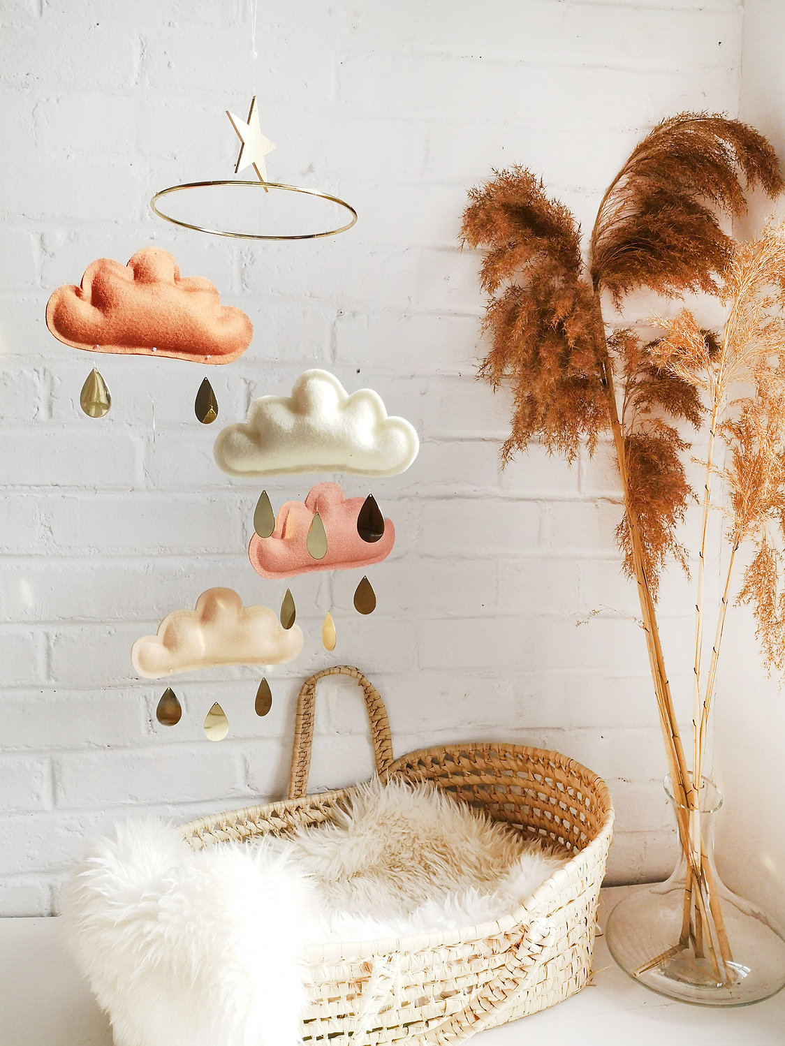 Ce mobile nuage en feutre avec gouttes dorées est un cadeau de naissance idéal. Une pluie de poésie pour votre décoration enfantine!Très simples à installer, les mobiles nuages The Butter Flying se suspendent au plafond comme un mobile au-dessus du lit d’un enfant!