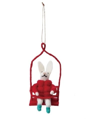 Cet adorable lapin en feutre profite de l'hiver pour aller skier! Habillée d'un petit manteau rouge et ses bottes bleus. Il apporte une touche ludique et festive à votre décoration.