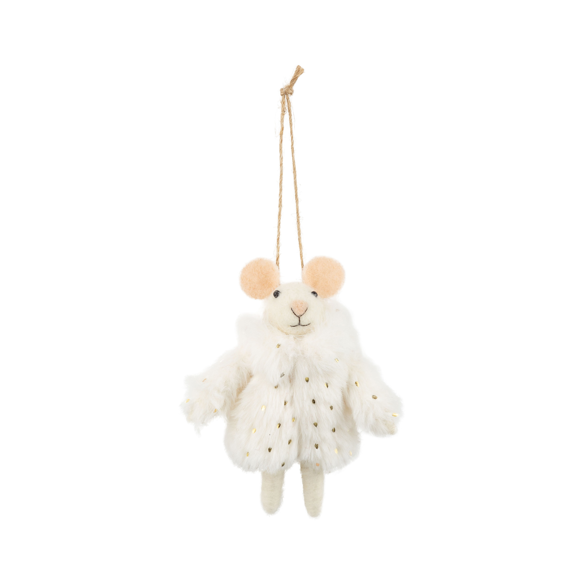 Apportez une touche d’élégance et de féérie à votre décor avec cette adorable souris en feutre, vêtue d’un somptueux manteau blanc en peluche orné de délicats détails dorés. Chic et raffinée, cette petite souris ajoutera une ambiance douce et festive à votre sapin ou à votre décoration hivernale.