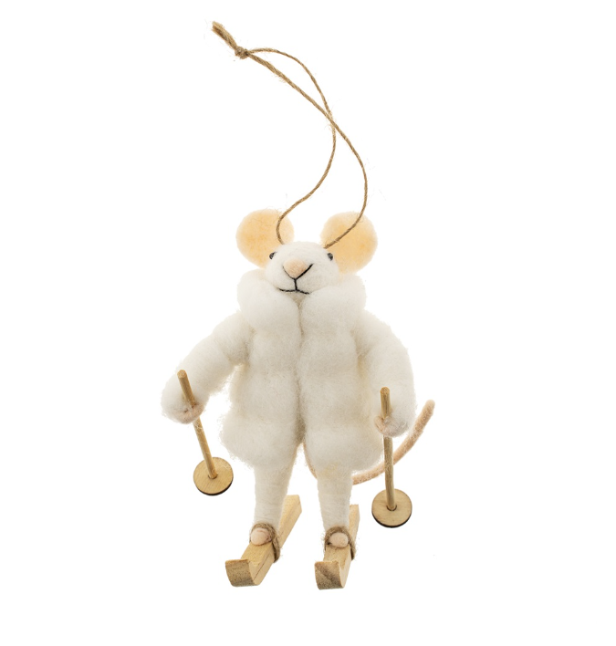Prête pour l’aventure en montagne, cette souris en feutre est équipée de skis et d’un gros manteau bien chaud.