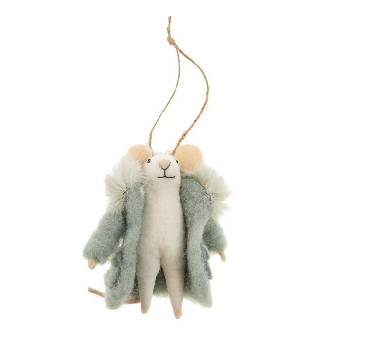 Bien emmitouflée dans son long manteau vert à col en fausse fourrure, cette souris en feutre affiche un look hivernal irrésistible.
