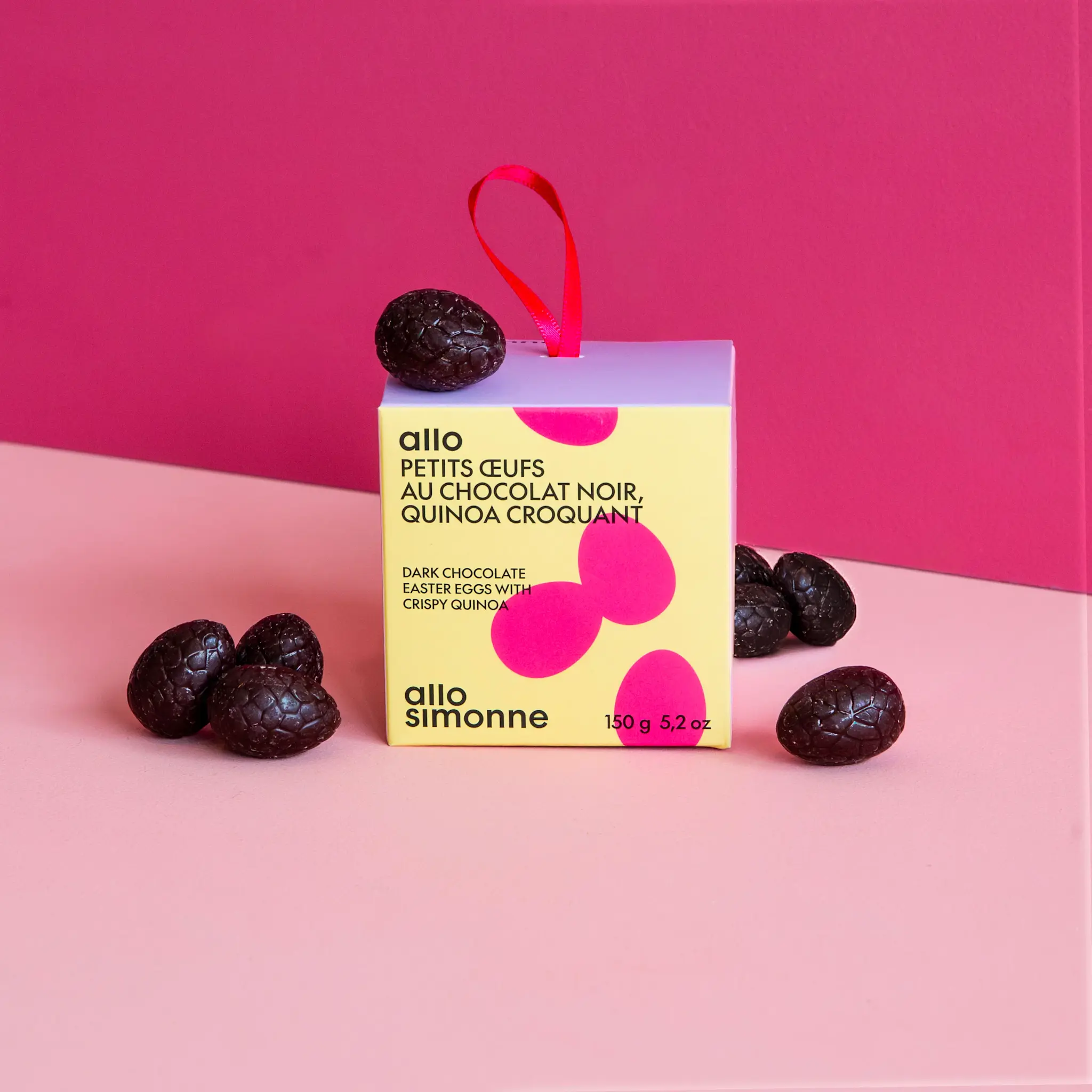 Des petits œufs au chocolat noir 70% avec du quinoa soufflé, de quoi ajouter un croquant très gaufré et gourmand.
