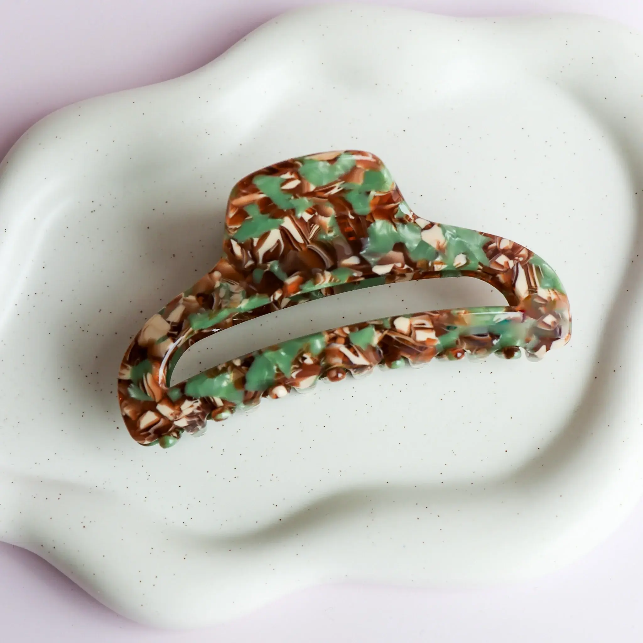 La pince à cheveux La Lydia est arrondie avec une découpe au centre dans les teintes de vert-sauge et bruns. Elle est idéale pour tous les types de cheveux.