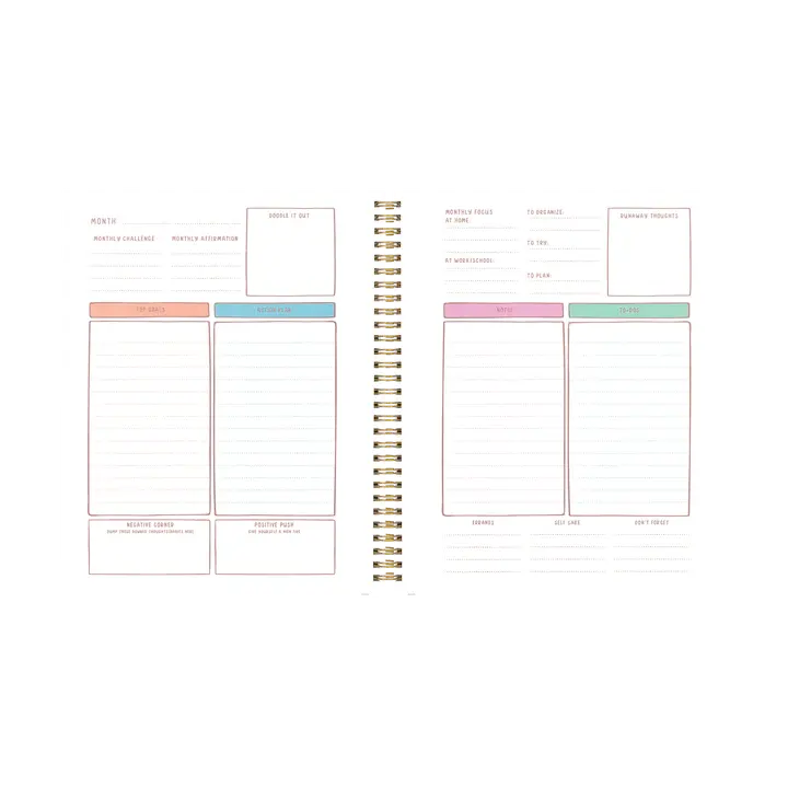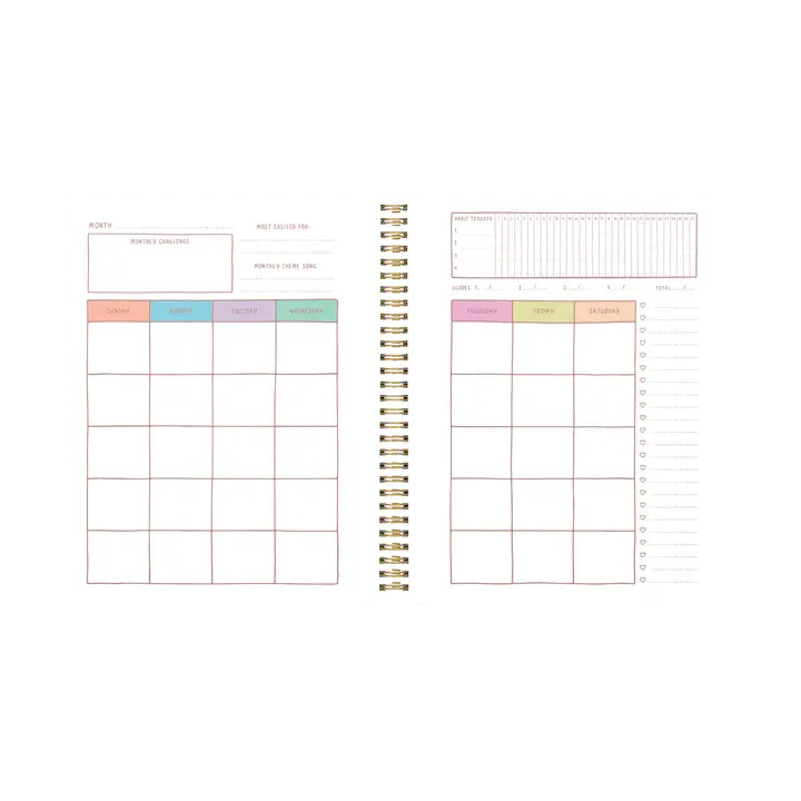 Ce planificateur n'est pas daté. Il suffit de renseigner les dates et c'est parti ! Le design dessiné à la main est imprégné de couleur et d'accessibilité Un classeur intérieur pratique et une feuille complète d'autocollants personnalisés Des compartiments répartis avec des instructions pour toutes vos listes à ne pas oublier Les tableaux de bord mensuels fournissent une vue d'ensemble du mois à venir avec un espace pour organiser vos tâches et vos objectifs Des grilles de calendrier mensuelles avec suffisamment d'espace pour enregistrer les événements, et notre outil de suivi des habitudes original avec un tableau de bord.