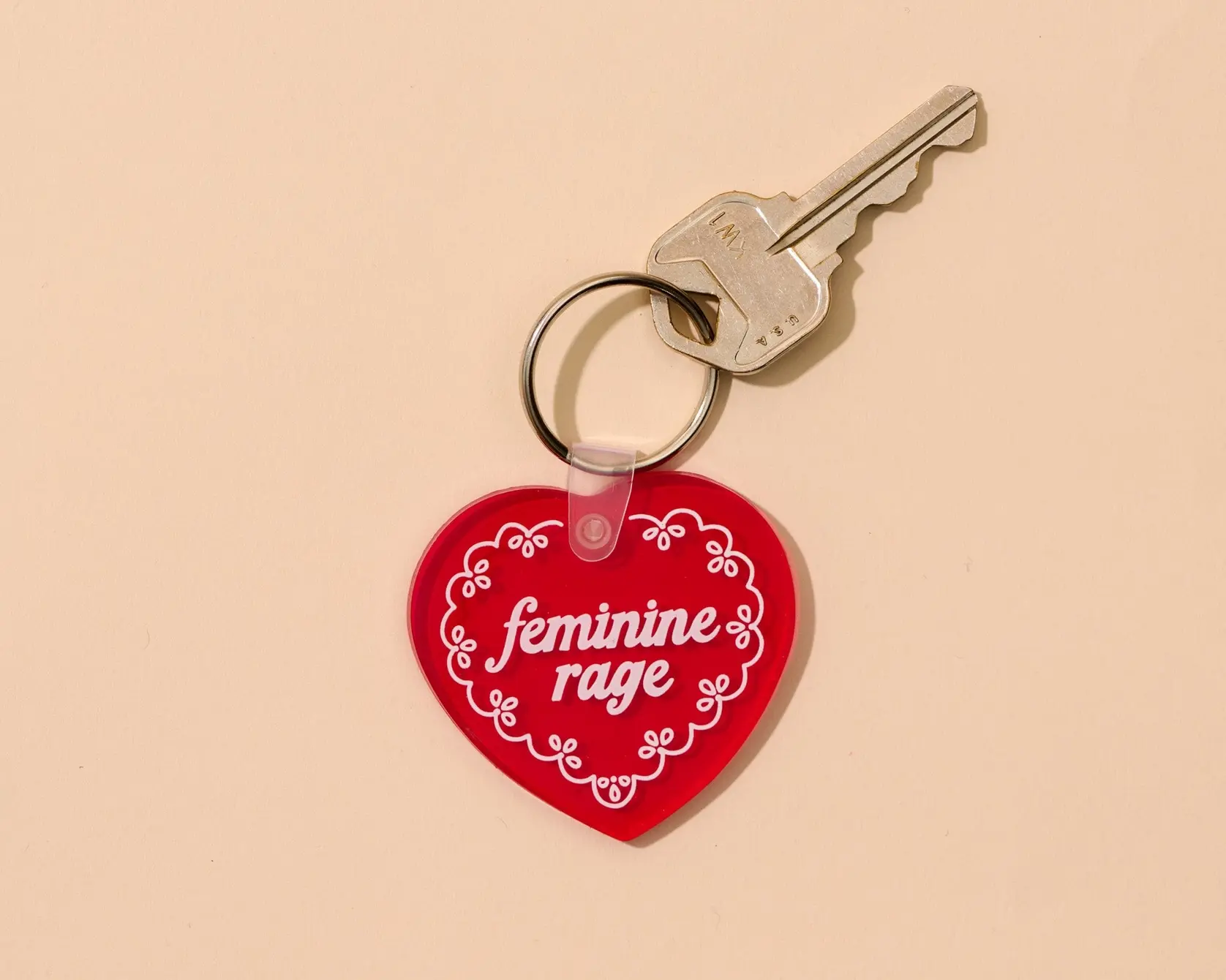Un porte-clés moderne et féministe en PVC signé Your Gal Kiwi, portant l’inscription « Feminine Rage » sur un napperon en forme de cœur en dentelle.