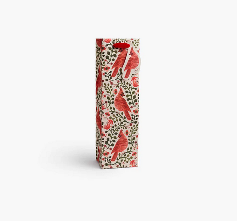 Offrez vos cadeaux avec élégance grâce à ce sac à vin aux motifs festifs de cardinaux, issu de la gamme Rifle Paper Co. Le design présente des oiseaux rouges délicatement illustrés sur un fond hivernal, enrichi de détails scintillants en foil rouge et vernis UV pailleté, pour un rendu à la fois raffiné et joyeux!