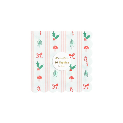 Pourquoi se contenter d'un seul motif de Noël quand on peut opter pour un mélange de motifs emblématiques sur sa table? Inspiré des papiers peints nostalgiques, ce modèle associe le rouge et le vert classiques à des rayures roses tendance pour une touche de fraîcheur. La bordure festonnée apporte également une touche de style. Ces petites serviettes en papier sont idéales pour s'agencer avec vos autres accessoires de fête.
