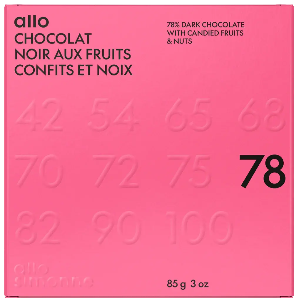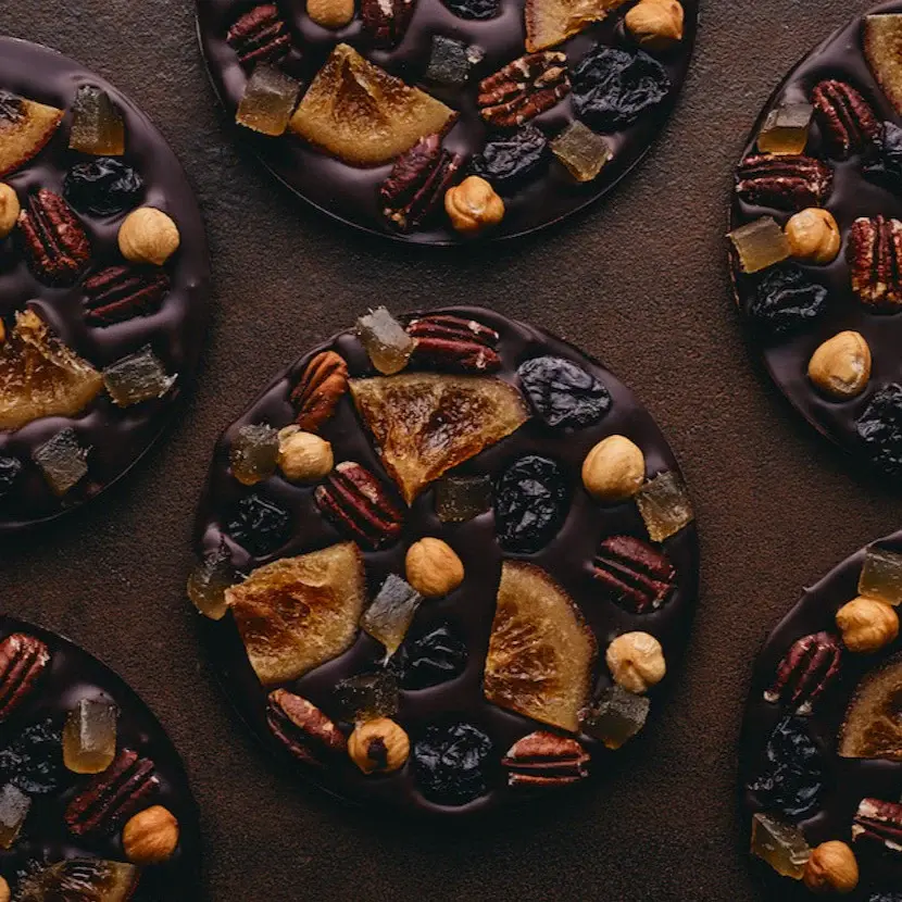 Ce délicieux mendiant au chocolat noir à 78% marie les notes intenses de cacao, les saveurs vibrantes des oranges confites par les chocolatiers chez Allo Simonne et le croquant réconfortant des noix.